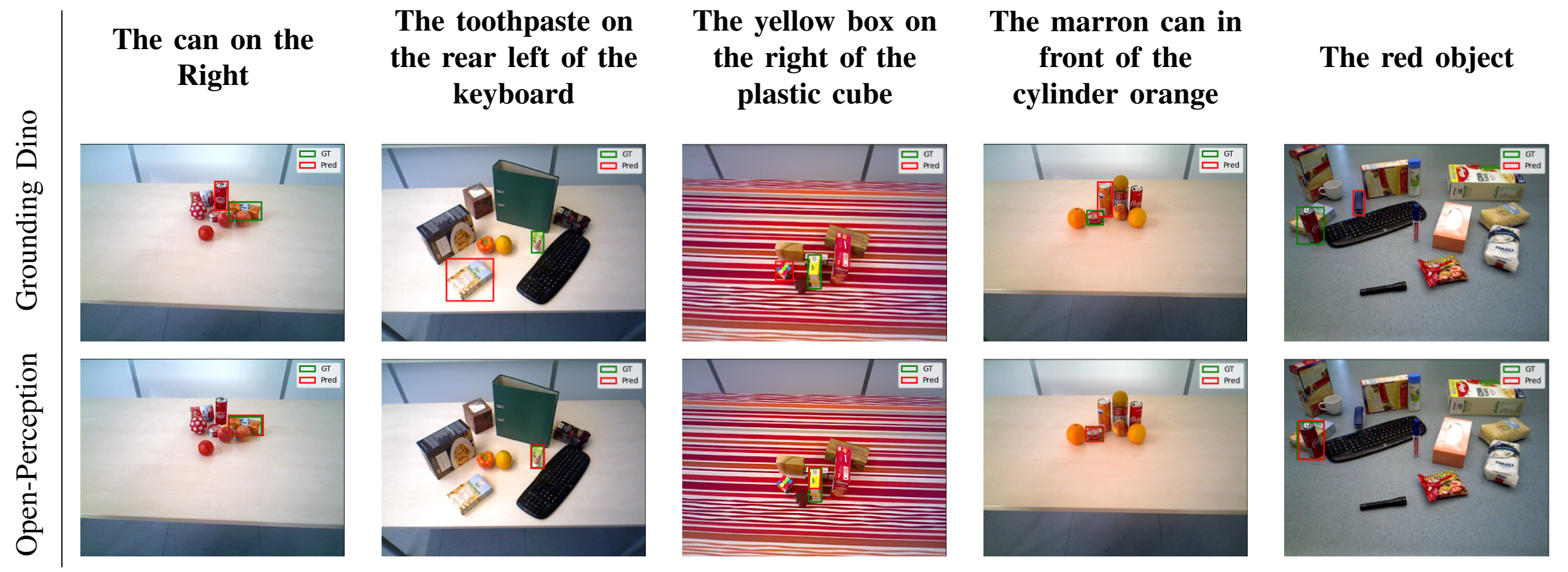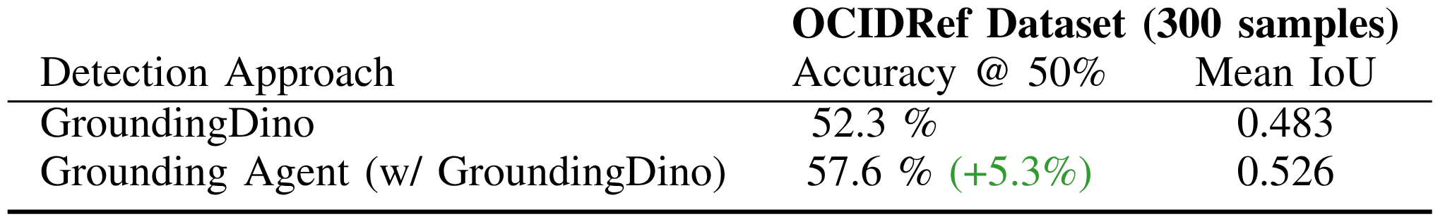 We benchmark our agent on the open-vocabulary detection dataset OCID-Ref*. OCID-Ref extends the Object Clutter Indoor Dataset (OCID) with natural language annotations referencing objects in cluttered scenes. Each environment presents several distractor objects and ambiguous prompts. From this dataset, we sample 300 scenes, whose annotations assume a viewer positioned at the front of the table. We compare the performance of our Grounding Agent against the highest-scoring detection from GroundingDINO.