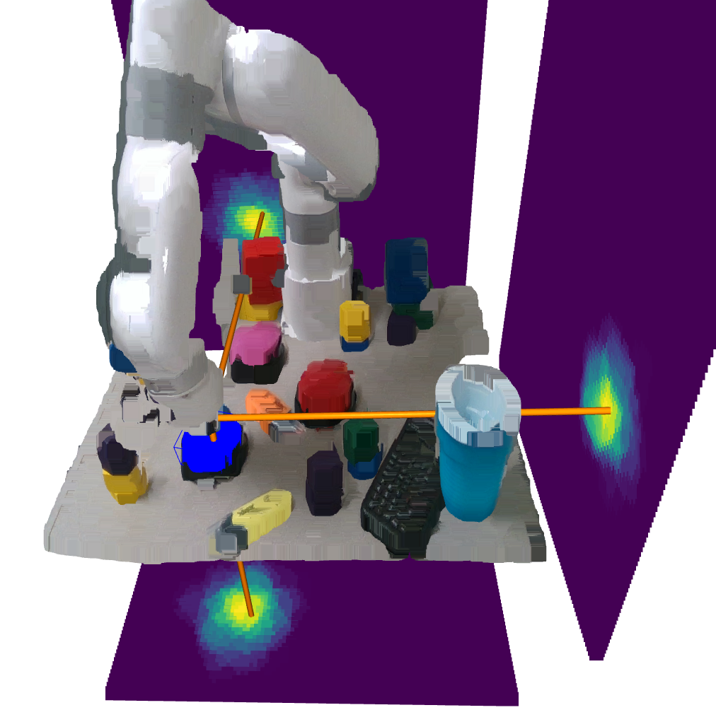Heatmap visualization of the guidance distribution, generated online by our proposed agentic framework. The distribution expresses the relevance of each possible future state for completing the task (e.g. "press the blue button"). The guidance is then used to bias the robot policy's action distribution towards the desirable behavior.