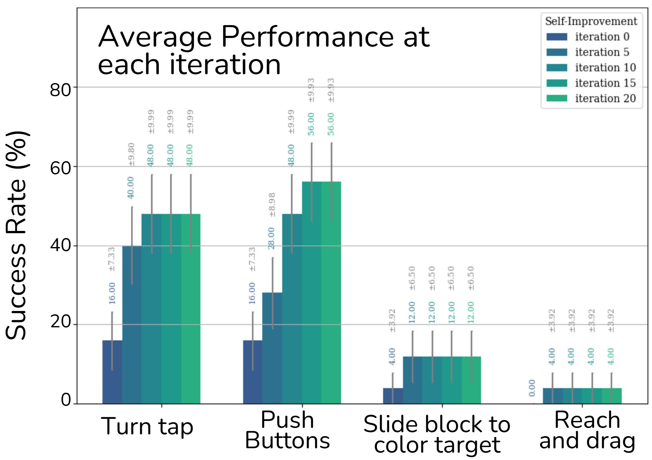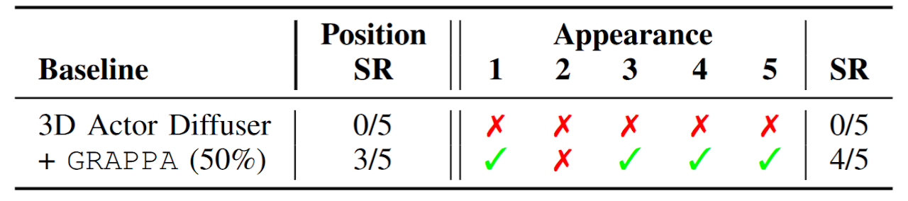 When guiding a completely random policy, GRAPPA is still able to achieve great success rates on tasks that don’t require fine-grained motions. Improving its performance at each iteration.