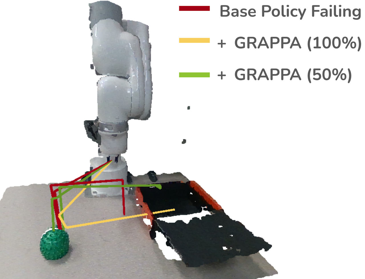 Illustration of the effect of different guidance percentages on a failure case of the base policy. In red we show the base policy failing in an out-of-distribution scenario; with 100\% of guidance (yellow), the end position is successfully above the box, but it has lost low-level notions. By balancing both with intermediate guidance (50%) shown in green, we can complete the task.
